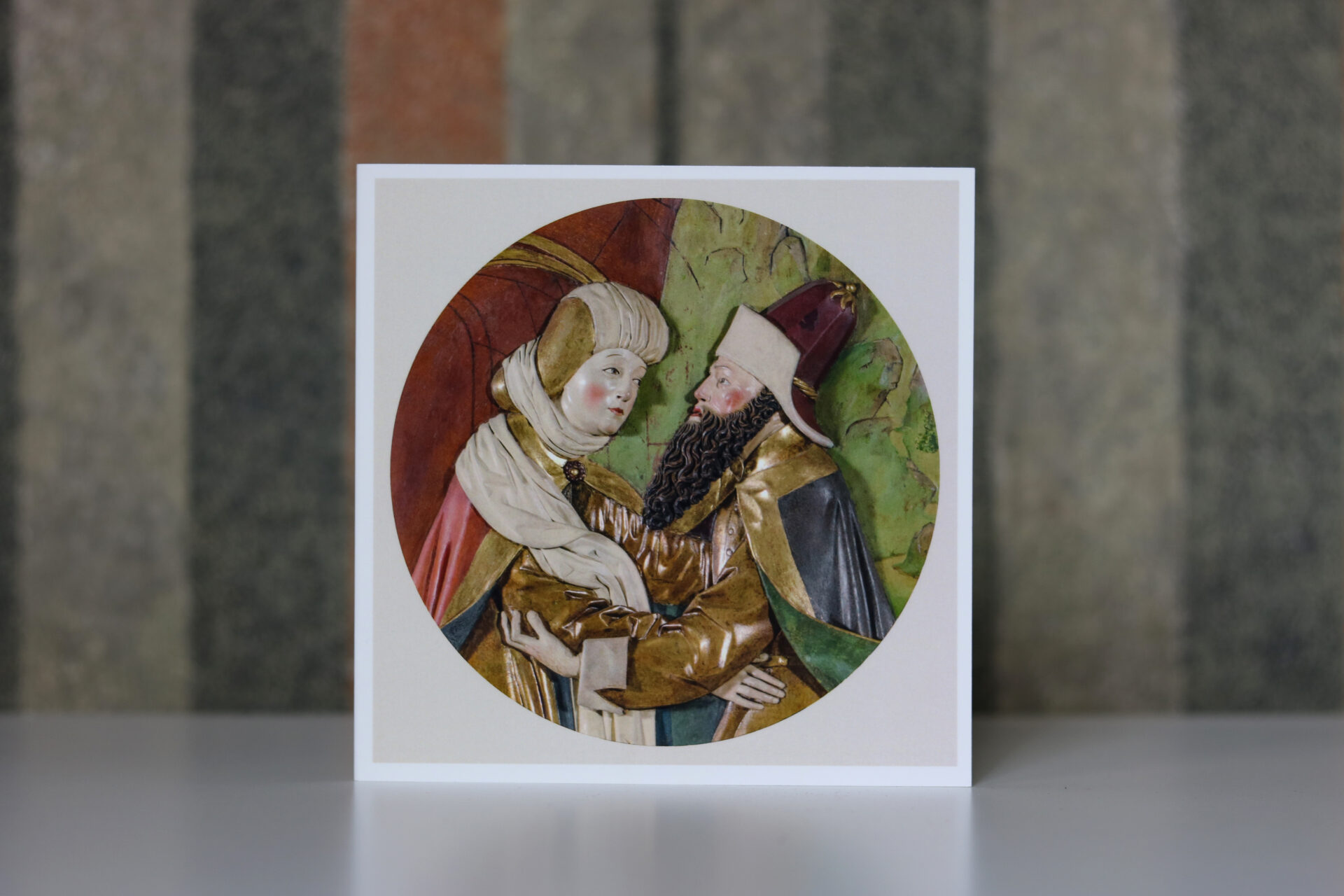 Kartka kwadratowa składana z fragmentem kwatery Spotkanie Joachima i Anny z ołtarza Wita Stwosza. W środku miejsce na wpisanie życzeń. Kartka sprzedawana z kopertą.