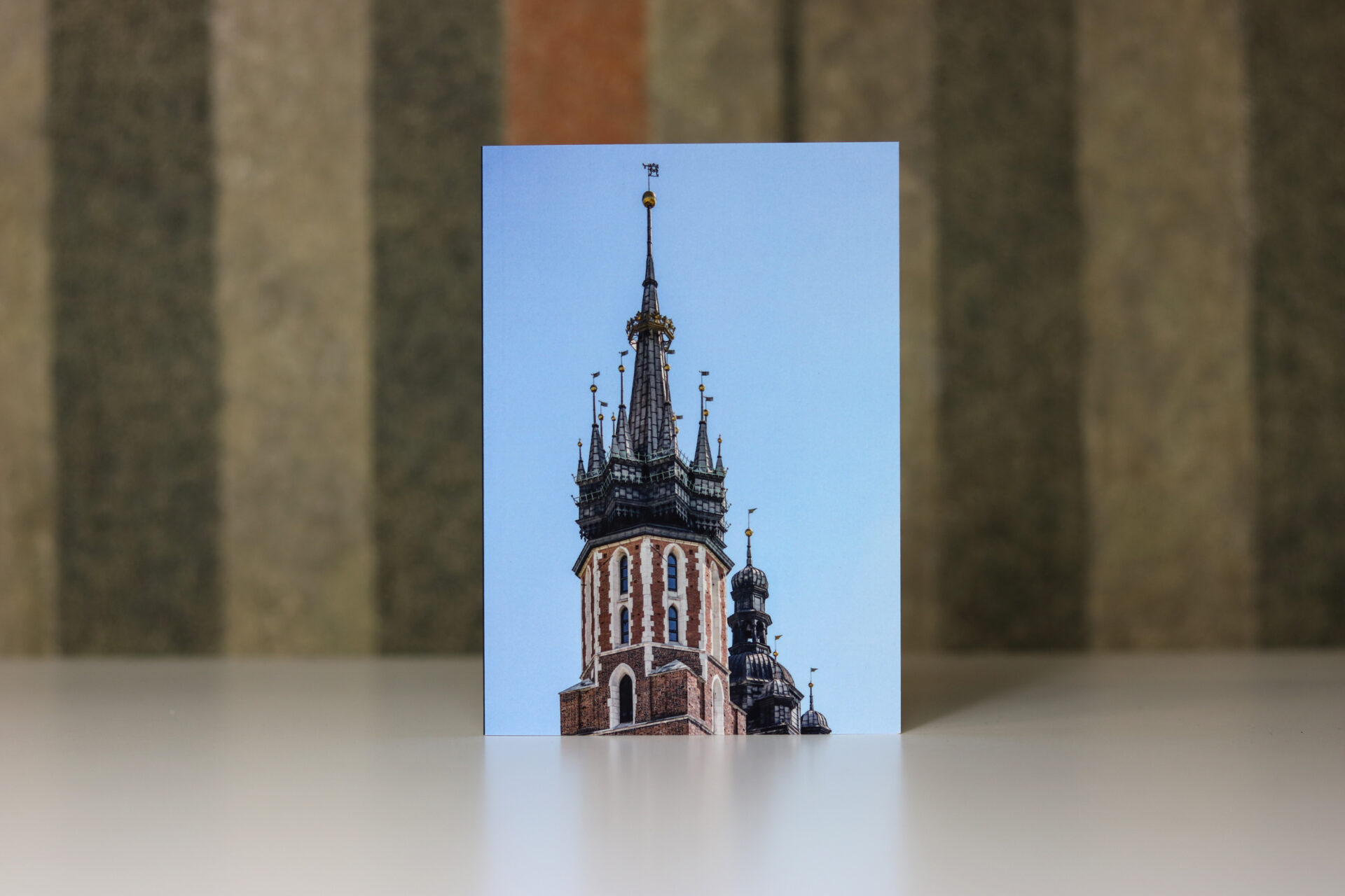 Notes z wieżami kościoła Mariackiego w Krakowie. Klejony, w formacie A6, gładki do zapisywania.