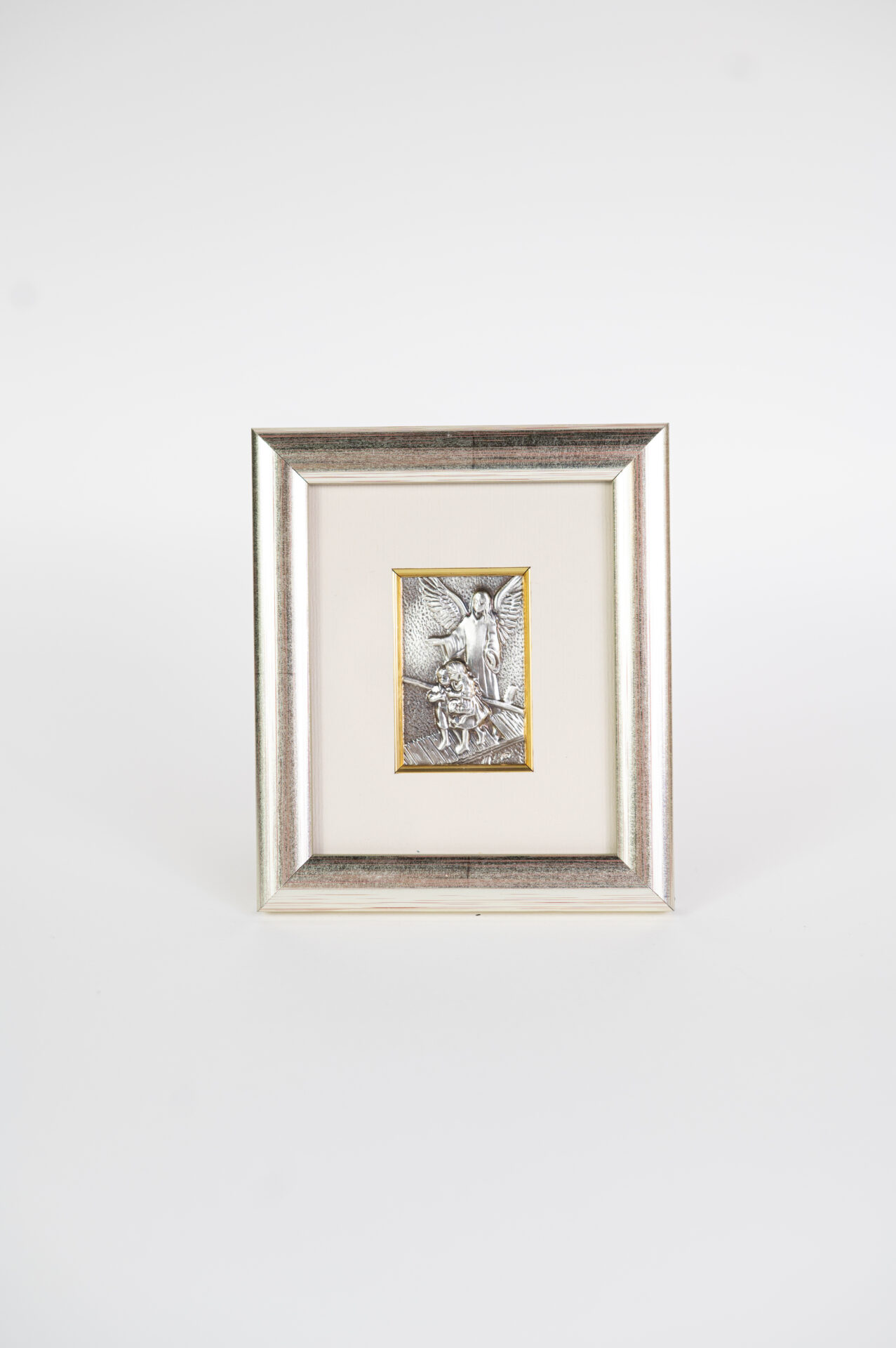 Produkt polski. Obraz w ramie drewnianej w kolorze srebrnym. Wizerunek wytłoczony w srebrnej blasze (próba 925), waga srebra 3-4g, osadzony w passe partout w kolorze ecru. Całość zabezpieczona szkłem. Możliwość powieszenia lub postawienia.