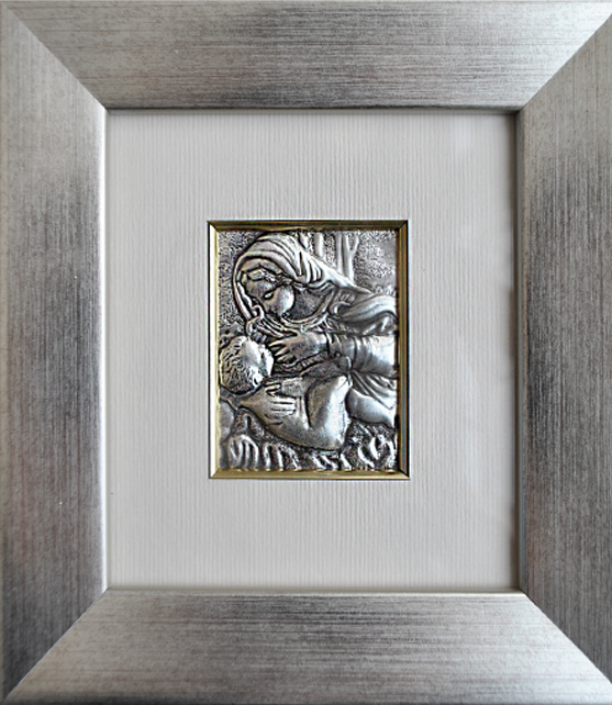 Produkt polski. Obraz w ramie drewnianej w kolorze srebrnym. Wizerunek wytłoczony w srebrnej blasze (próba 925), waga srebra 3-4g, osadzony w passe partout w kolorze ecru. Całość zabezpieczona szkłem. Możliwość powieszenia lub postawienia.