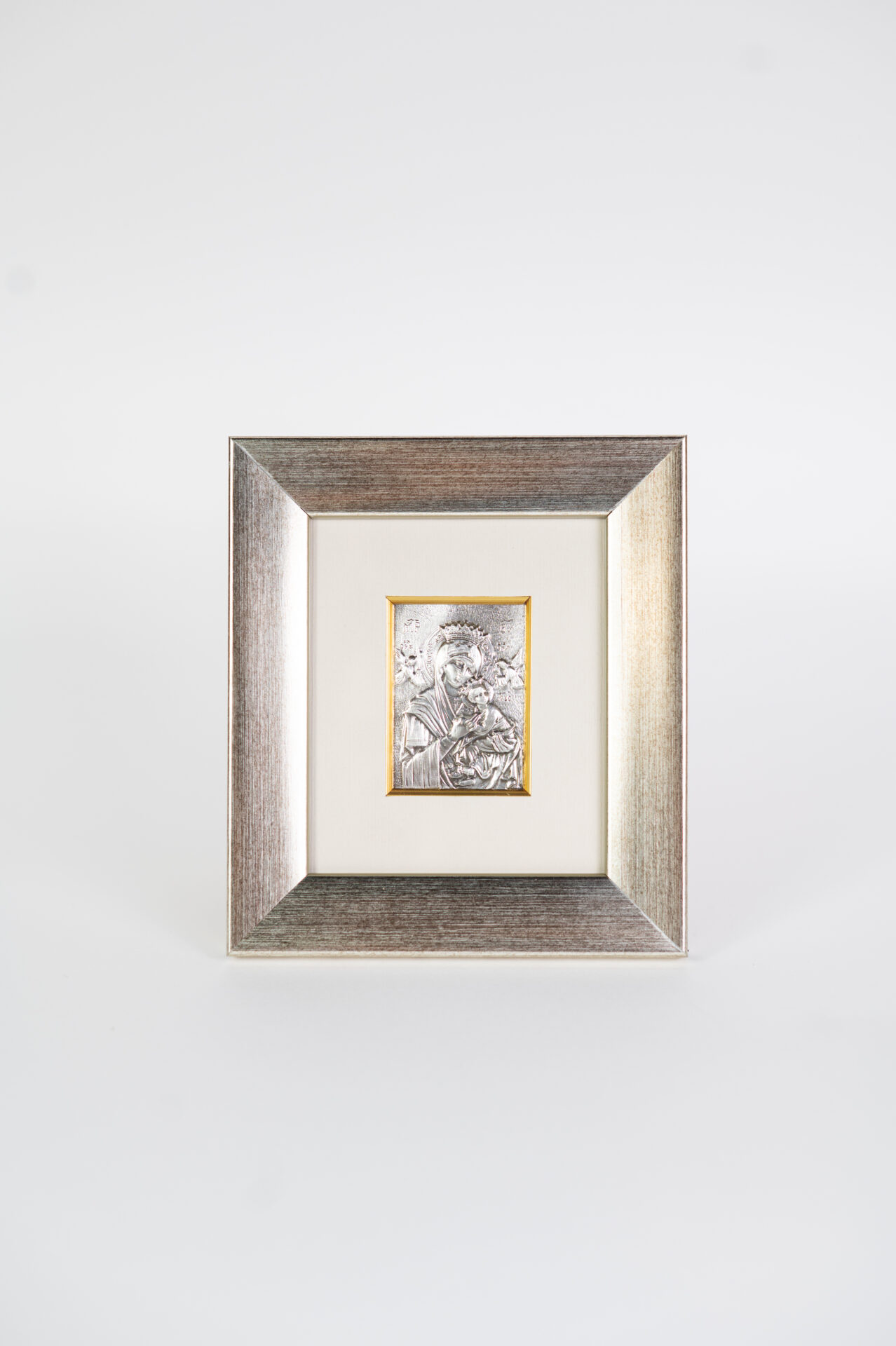Produkt polski. Obraz w ramie drewnianej w kolorze srebrnym. Wizerunek wytłoczony w srebrnej blasze (próba 925), waga srebra 3-4g, osadzony w passe partout w kolorze ecru. Całość zabezpieczona szkłem. Możliwość powieszenia lub postawienia.