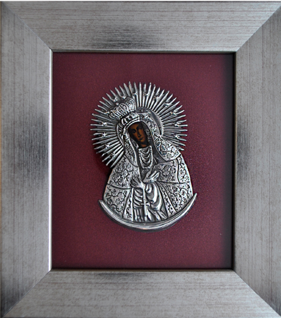 Produkt polski. Obraz w ramie drewnianej w kolorze srebrnym. Wizerunek wytłoczony w srebrnej blasze (próba 925), waga srebra 3-4g, osadzony na bordowym welurze. Całość zabezpieczona szkłem. Możliwość powieszenia lub postawienia.