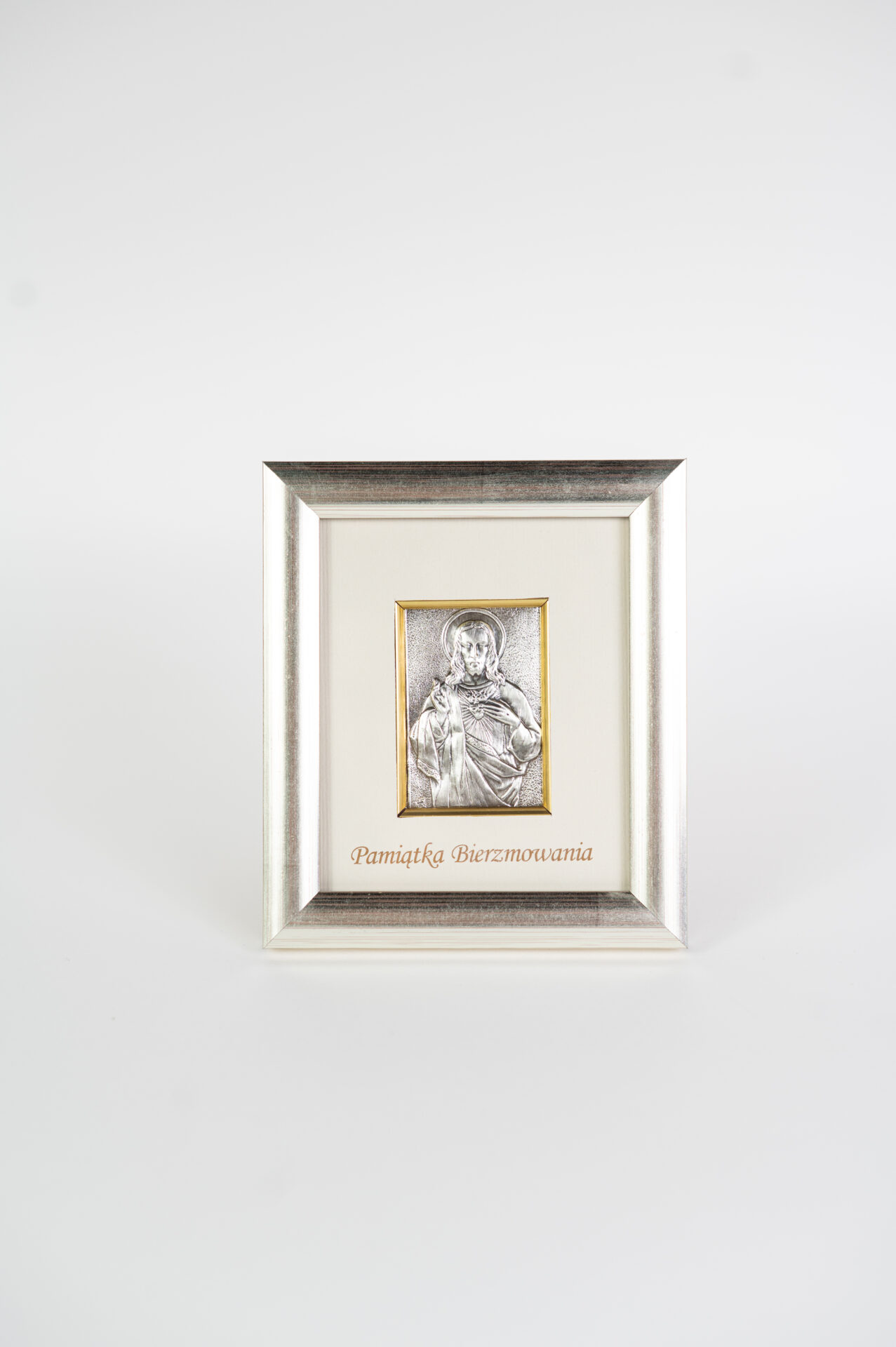 Produkt polski. Obraz w ramie drewnianej w kolorze srebrnym. Wizerunek wytłoczony w srebrnej blasze (próba 925), waga srebra 3-4g, osadzony w passe partout w kolorze ecru. Całość zabezpieczona szkłem. Możliwość powieszenia lub postawienia.