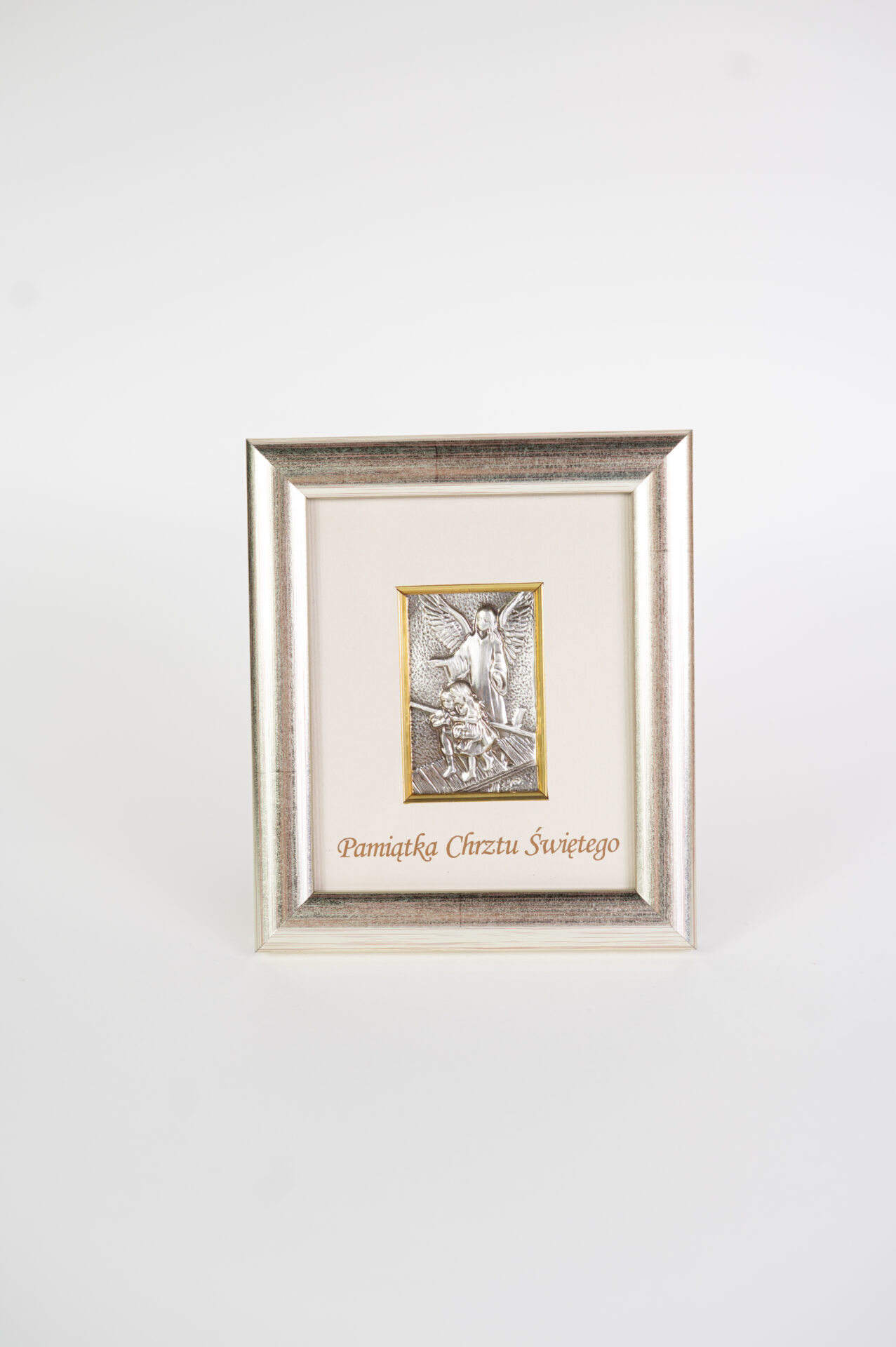 Produkt polski. Obraz w ramie drewnianej w kolorze srebrnym. Wizerunek wytłoczony w srebrnej blasze (próba 925), waga srebra 3-4g, osadzony w passe partout w kolorze ecru. Całość zabezpieczona szkłem. Możliwość powieszenia lub postawienia.