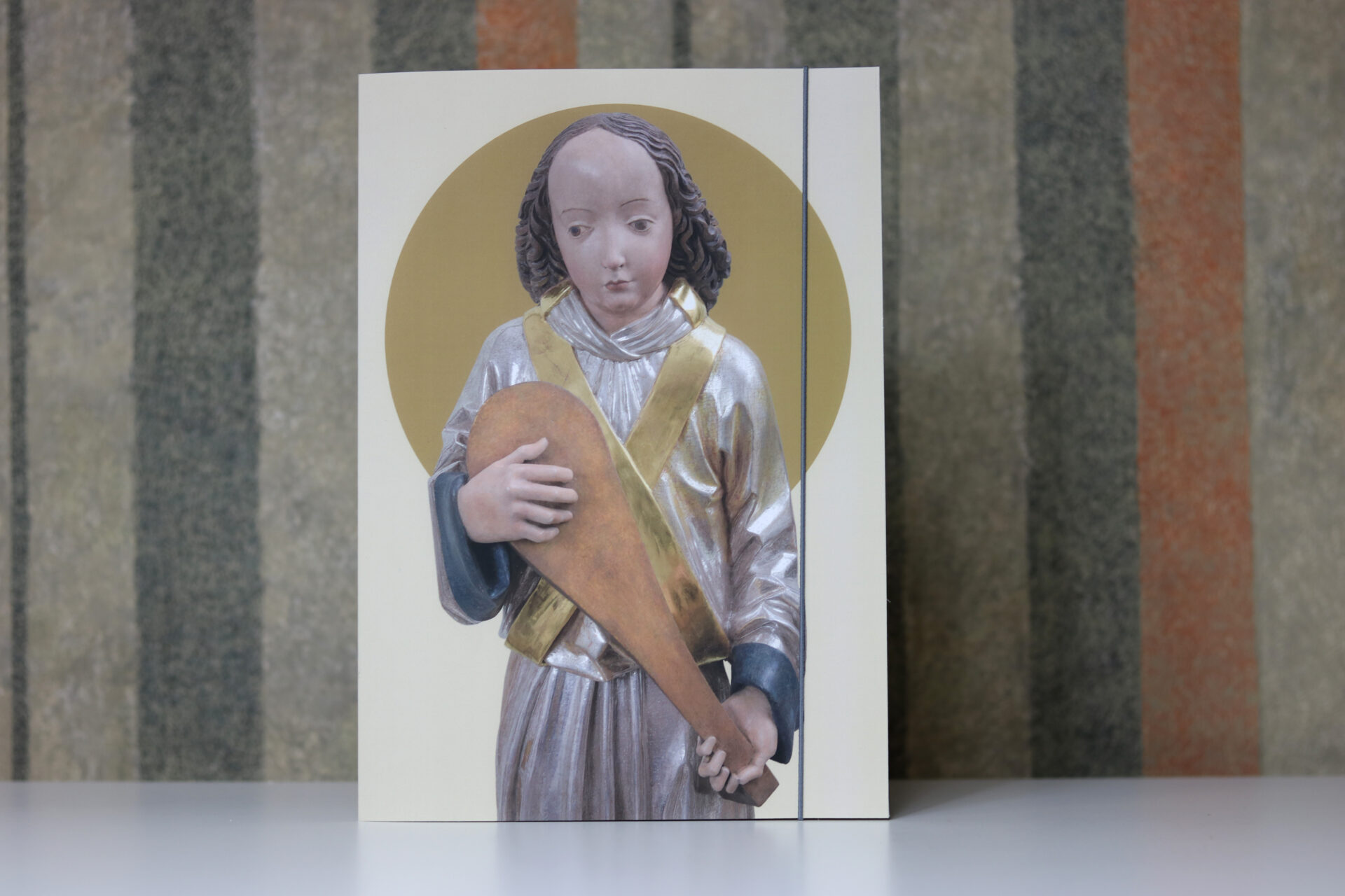 Teczka z aniołem z lutnią z zwieńczenia ołtarza Wita Stwosza. Format A4 ze skrzydełkami i gumką dopasowaną kolorem do grafiki.