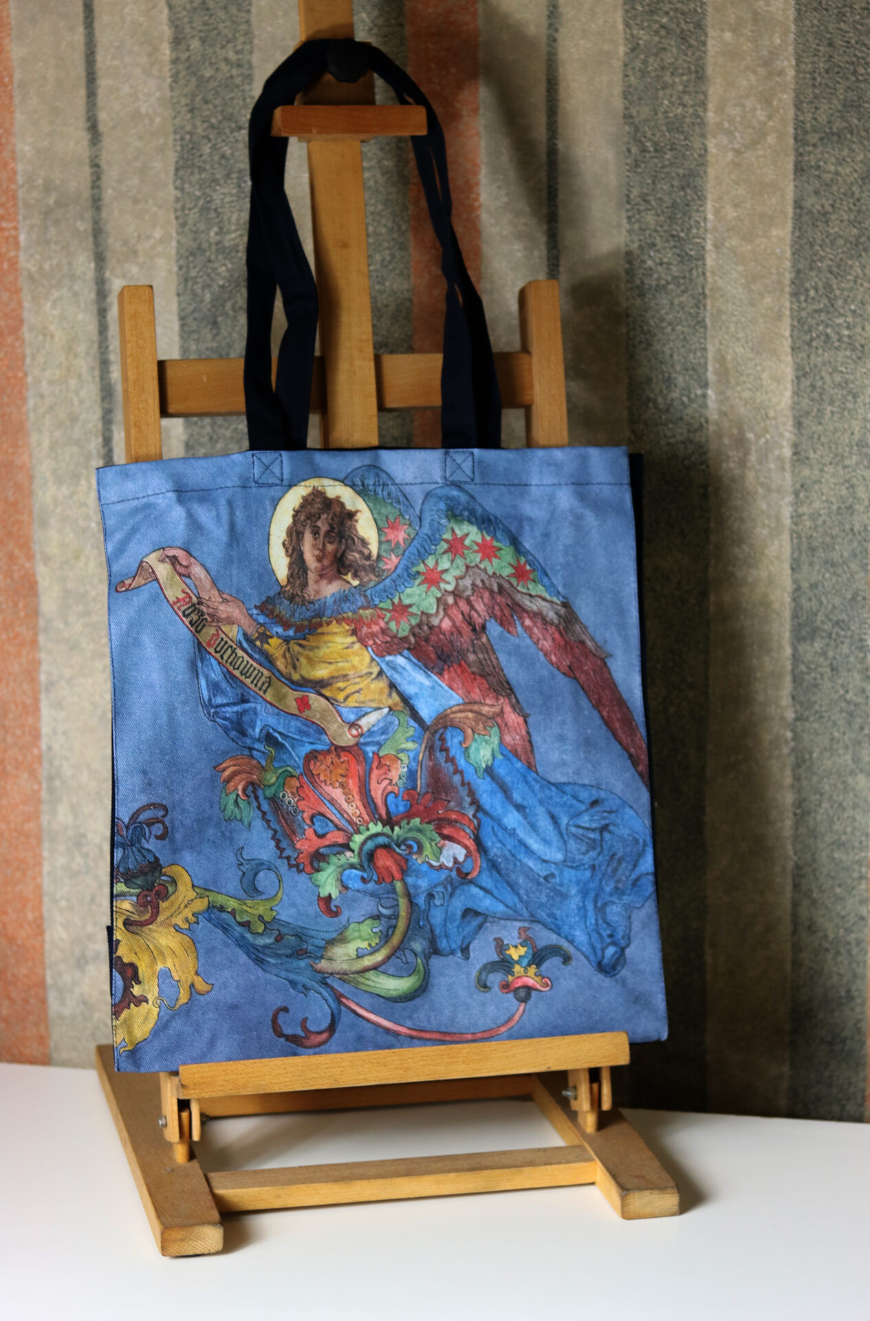 Praktyczna torba na ramię z aniołem z polichromii Jana Matejki z prezbiterium kościoła Mariackiego. Wykonana z bawełny, posiada poszerzane dno i boki. W wygodnej torbie zmieści się format A4.