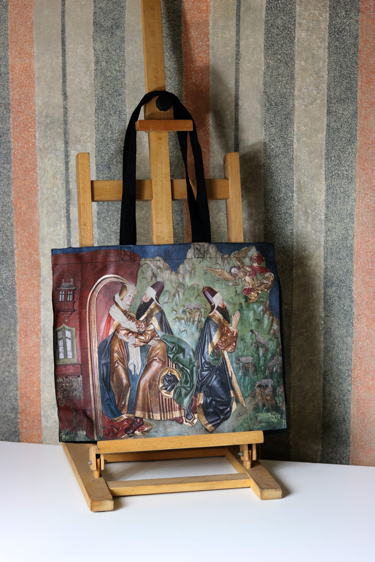 Praktyczna torba na ramię z motywem z kwatery Spotkanie Joachima i Anny z ołtarza Wita Stwosza. Wykonana z bawełny, posiada poszerzane dno i boki. W wygodnej torbie zmieści się format A4.
