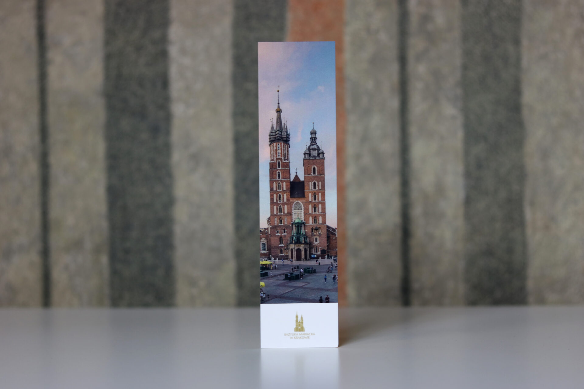 Kartonowa zakładka do książki z kościołem Mariackim w Krakowie.