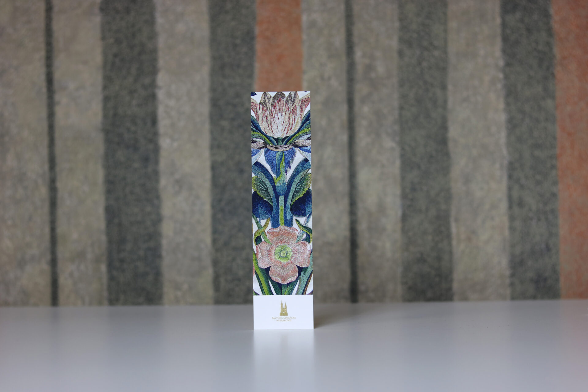 Kartonowa zakładka do książki z motywem kwiatowym z ornatu wykonanego przez Gabriela Malinowskiego w XVII w.