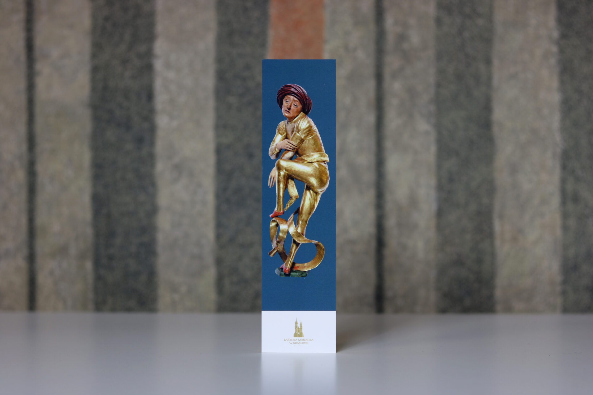Kartonowa zakładka do książki z figurą żaczka z ołtarza Wita Stwosza.